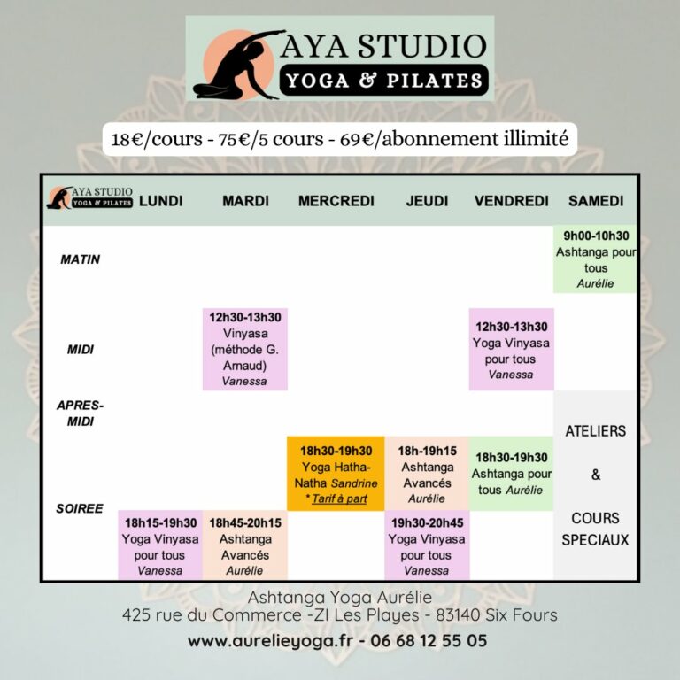 Nous vous accueillons au studio AYA (Ashtanga Yoga Aurélie) à Six Fours – La Seyne, dans la Zone des Playes tous les matins, les midis et les soirs. Cours de yoga doux, yoga Ashtanga, hatha et Pilates.
